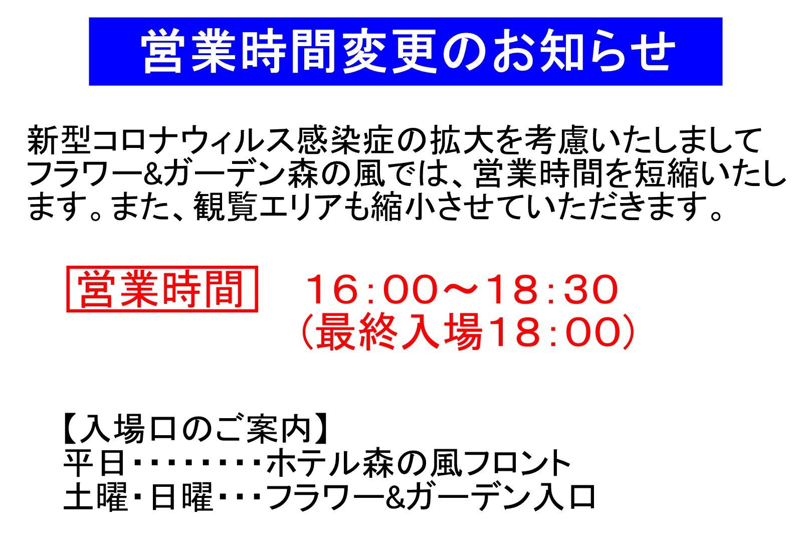 今シーズンのイルミネーション営業も開催致しました。 ただ、岩手県内もコロナウィルス感染の拡大が見られる為、営業時間の変更をお知らせ致します。 入場口は、平日は「ホテル森の風」正面玄関からフロントでの入場受付で、土日は「フラワー&ガーデン」の正面入り口からとなります。 ご理解・ご協力の程よろしくお願い致します。