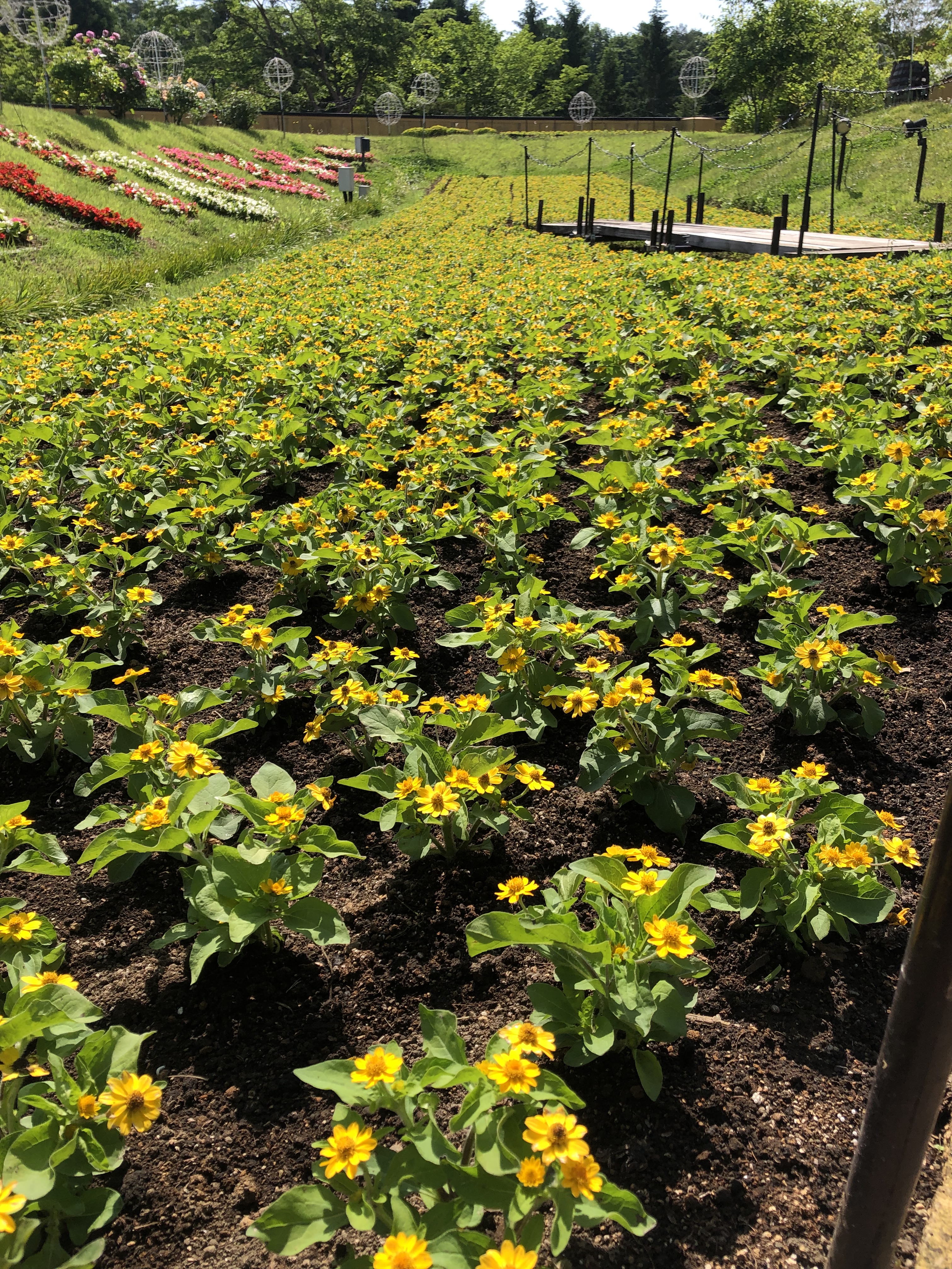 ネモフィラ植替え終了\(^o^)/ 2025/06/15 みなさん、おはようございます(*^_^*) 春に大人気でしたネモフィラもピークを過ぎましたので、スタッフ総動員でメランポジウムに植替え致しました。 真っ青のお庭から黄色のお庭にチェンジですよ(^_^)v メランポジウム